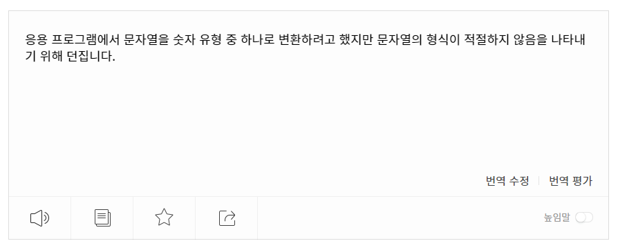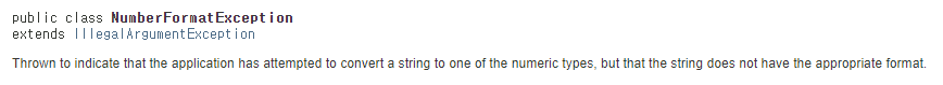 즉, 문자열을 숫자로 변환하려고 했는데 실패했을 경우 던지는 예외이다.