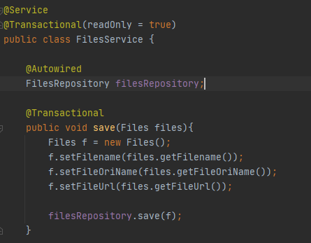 File엔티티를 만들어 준다. 저장될 파일 이름(filename), 업로드할 원래 파일의 이름(fileOriName), 저장할 장소(fileUrl)를 만들어준다.