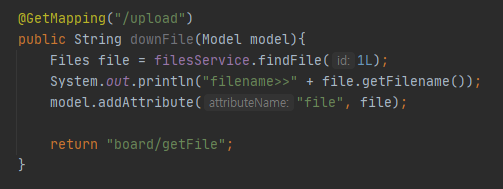 간단하게 알아보기 위해서 임의로 1L을 변수로 넣고 찾은 file을 model에 넣고 Thymeleaf에 데이터를 넘겨주었는데