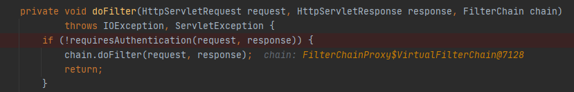 여기서 true를 반환해서 3번(Authentication객체 생성)으로 넘어간다. /login이 아니라 다른 url을 호출할 경우 doFilter를 통해 처리가 된다.