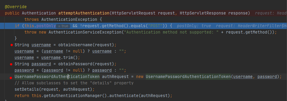 여기서 attempAutentication은 UsernamePasswordAuthenticationFilter안에 구현되어있다.