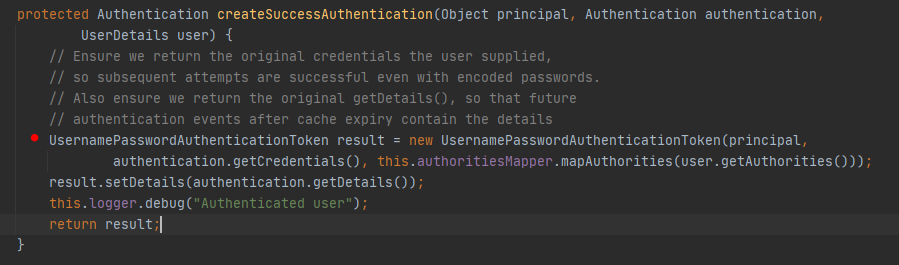 인증을 성공한 이후에 createSuccessAutentication에서 인증객체를 다시 생성한다.