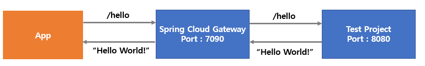 실제로 /hello경로는 8080포트인 Test 프로젝트에 되어있지만 7090포트에 /hello 경로로 요청을 보내면 똑같은 결과를 반환합니다.