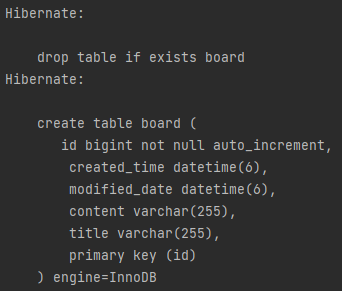 - create-drop : 실행될 때 테이블이 생성되며 종료 시 테이블이 삭제 됩니다. 테스트 환경에 적합합니다.