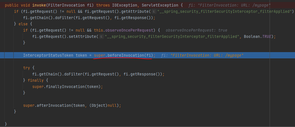 FilterInvocation객체를 super.beforeInvocation으로 넘겨줍니다.