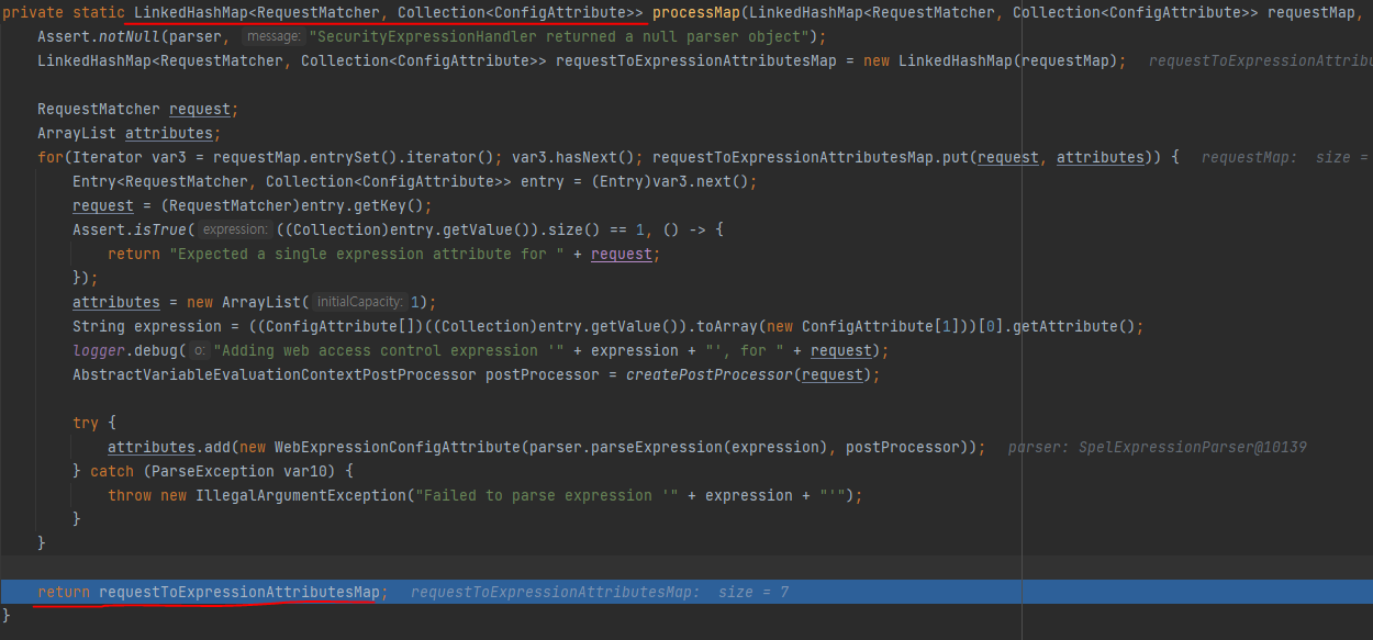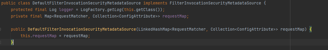 반환타입은 LinkedHashMap<RequestMatcher, Collection<ConfigAttribute>>으로 되어있습니다.