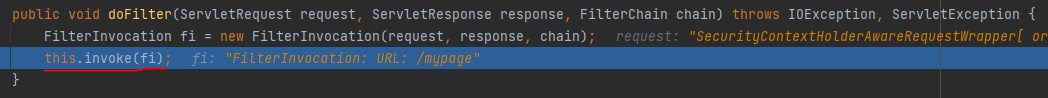 그리고 invoke메서드에 FilterInvocation객체를 넘겨줍니다.