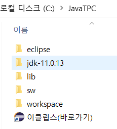 폴더는 C드라이브에서 JavaTCP폴더를 만들었습니다. 어느곳이든 이 폴더만 있으면 이클립스가 실행하도록 하려고 합니다.