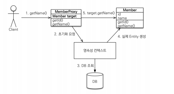 getName을 호출하면 프록시에는 값이 없기 때문에 영속성 컨텍스에게 부탁해 DB를 조회하여서 실제 엔티티를 생성하면,