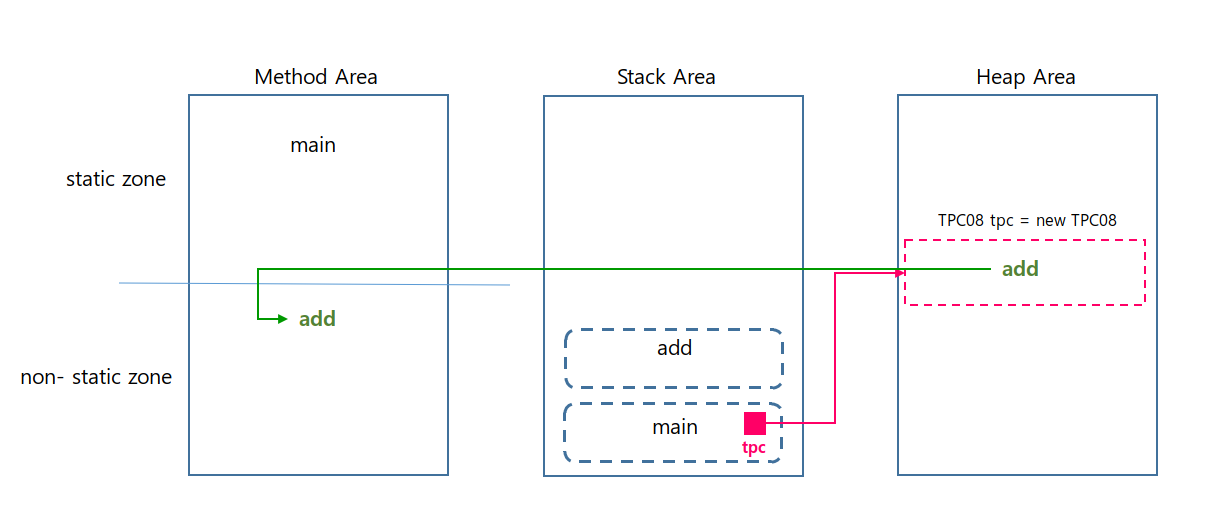 객체 선언 후 객체에서 add를 호출하면 Heap Area에서 add가 생성되고 이것은 non-static zone의 add를 가리키게 됩니다.
