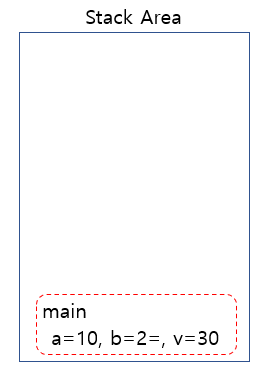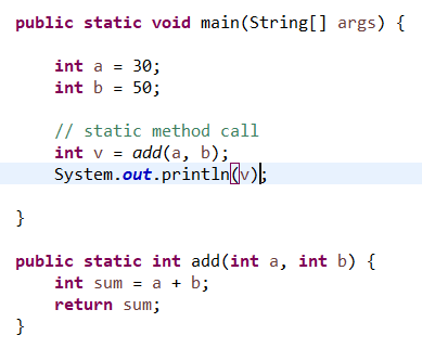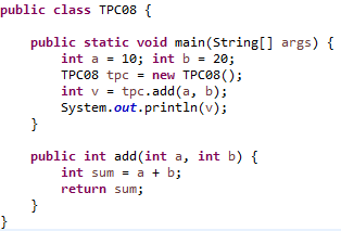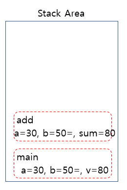 main메서드는 변수 a와 b를 30, 50으로 선어하였고 add메서드를 통해 v를 선언하였습니다.