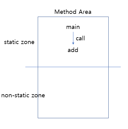 처음에 프로그램이 실행되면 Method Area에는 static zone에는 main메서드가, non-static zone에는 add메서드가 존재하게 됩니다.