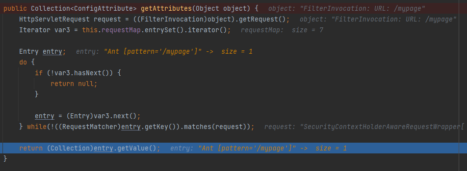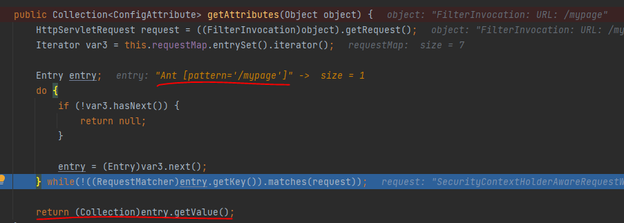위에서 설명했듯이 요청정보와 requestMap에 존재하는 값이 일치한다면 권한정보를 리턴합니다.