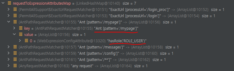 예를 들어, Spring Security 설정 파일에서 위의 사진과 같이 URL과 그에 맞는 권한 정보를 설정해주었다면 이것은 ExpressBasedFilterInvocationSecurityMetadataSource의 requsetToExpressionAttributesMap에 저장됩니다.