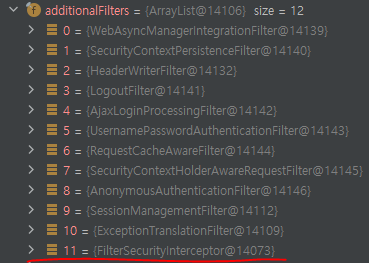 FilterSecurityInterceptor는 사용자가 권한이 있는 페이지에 접속할 때 접속 가능 여부를 판단하는 Filter이며, Filter중 제일 마지막에 위치하고 있습니다.