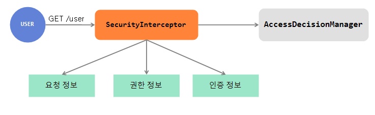 FilterSecurityInterceptor에서는 요청정보, 권한정보, 인증정보가 필요하며 이것을 획득하면 AccessDecisionManager에게 보내서 이곳에서 인가처리를 하게 됩니다.