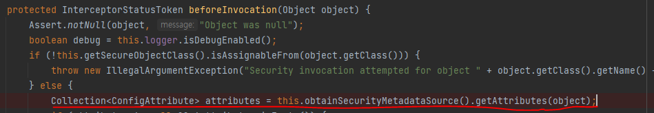 Object형태로 넘어온 FilterInvocaton객체를 this.obtainSecurityMetadataSource().getAttributes로 넘겨줍니다.