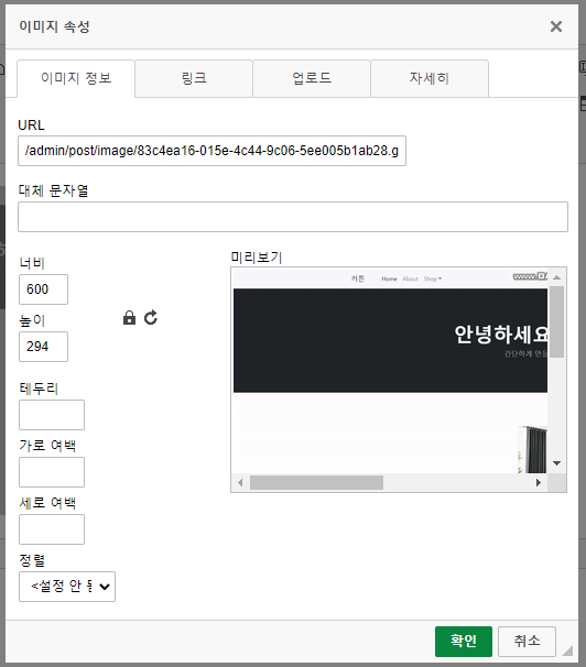ckeditor_config 설정을 완료한 뒤 이미지 전송 창입니다.